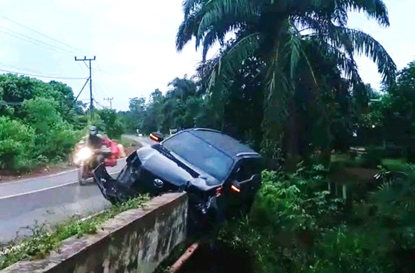 Berdasarkan keterangan yang dihimpun, mobil jenis SUV warna hitam tersebut diduga menabrak bagian pembatas jembatan sehingga mengalami kerusakan cukup serius pada bagian depan.