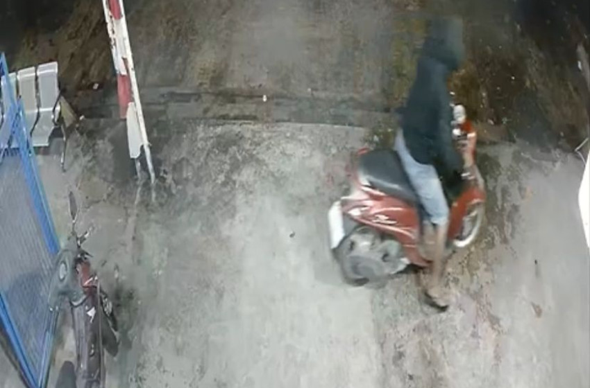 Dari rekaman kamera pengawas yang terpasang di depan bangunan, tampak dua sepeda motor terparkir rapi. Tak lama, seorang pria mengenakan hoodie hitam mendekat dan membawa kabur motor milik korban.