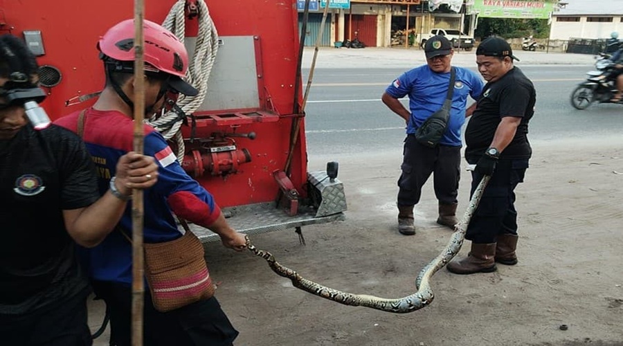 kanalkalteng.com , Palangka Raya - Seekor ular piton yang melilit kucing membuat warga di kawasan Jalan Tjilik Riwut Km 2, tepatnya di seberang Karaoke Happy Puppy, geger. Kejadian tersebut langsung dilaporkan ke tim Rescue Dinas Pemadam Kebakaran dan Penyelamatan (Damkar) Kota Palangka Raya.